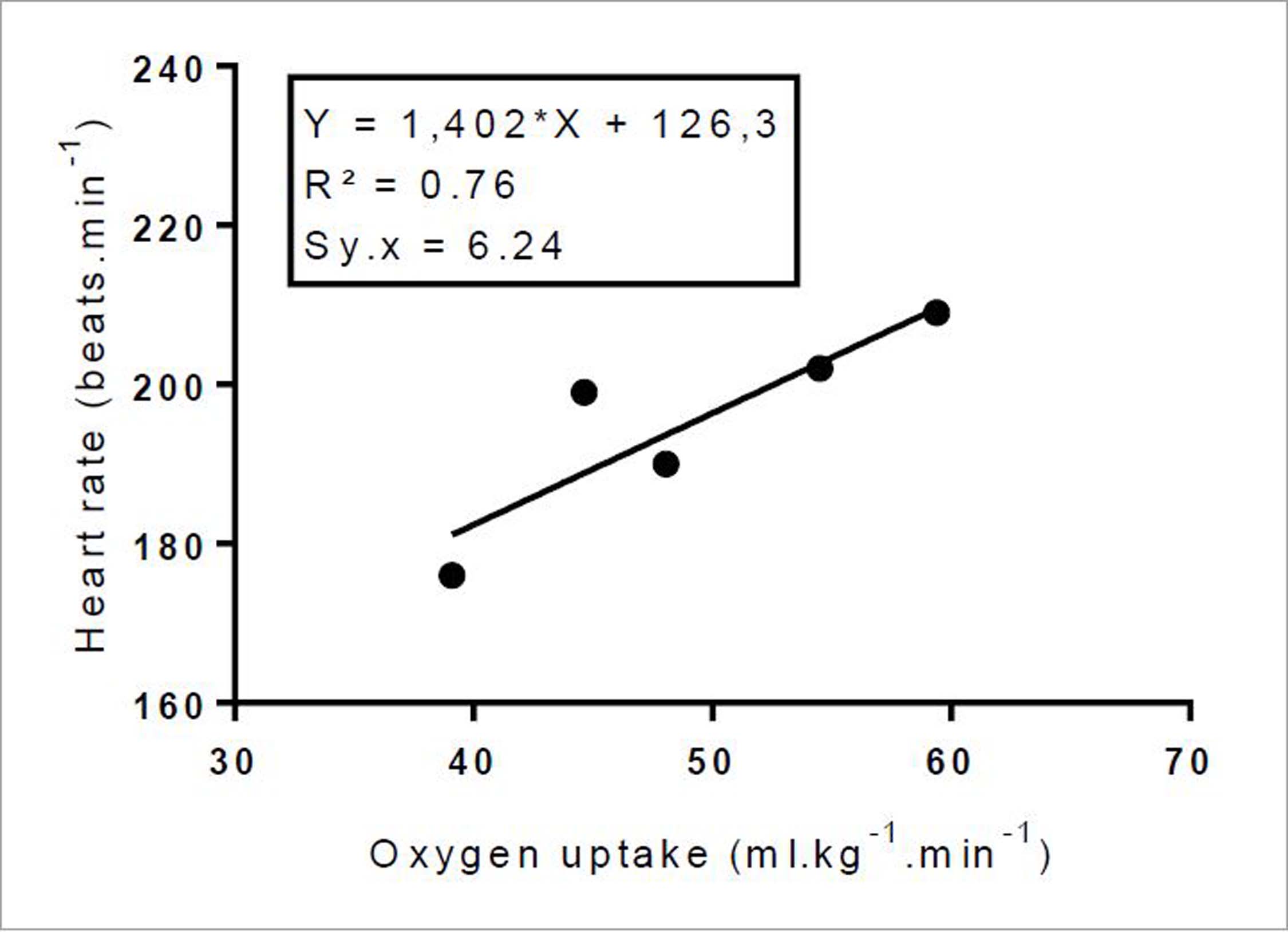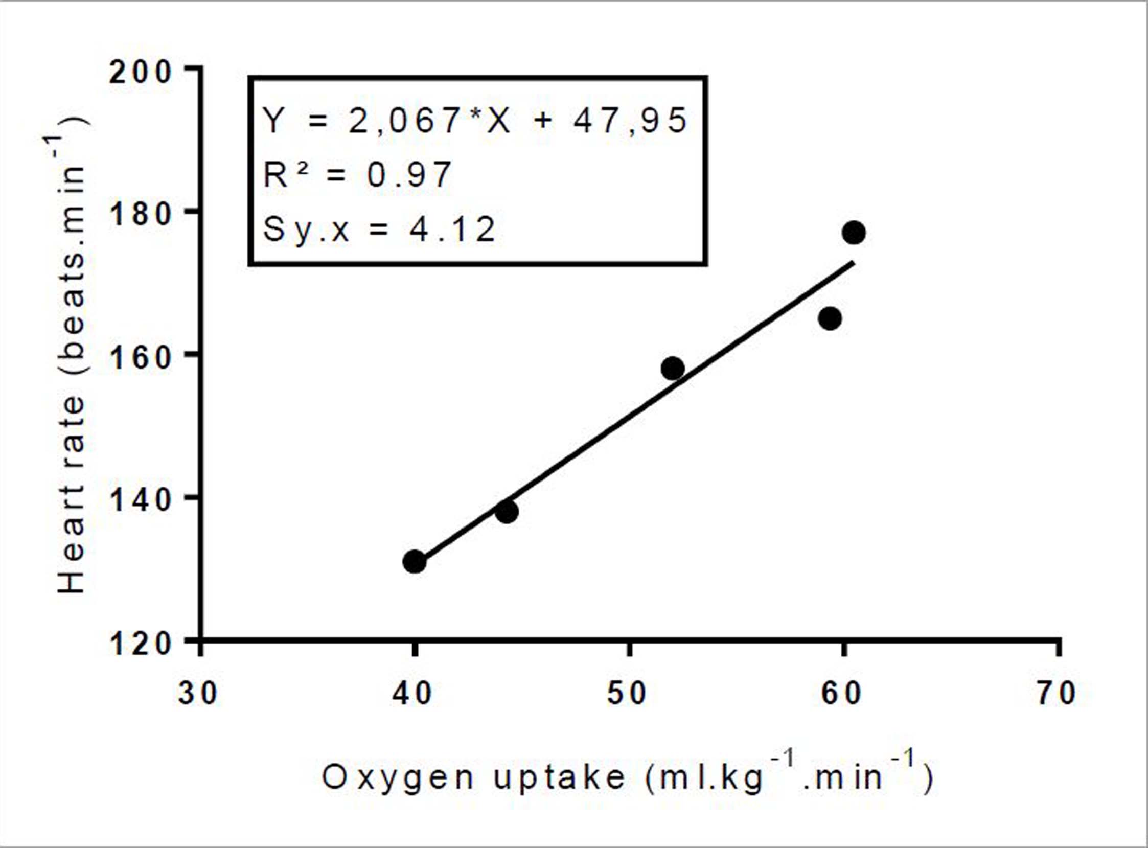 The main finding was that the heart rate correlated strongly (with low standard error) with oxygen uptake in both studied groups. The results also showed that the endurance runners presented clearly a stronger correlation between HR and VO2, which may indicate that the level of aerobic ability interferes with this relationship. This hypothesis can also be supported by the greater slope of the regression line of group B (b values). This means that sprinters increase more at HR for each mL·kg-1·min-1 increase in VO2 (Reis et al., 2011).