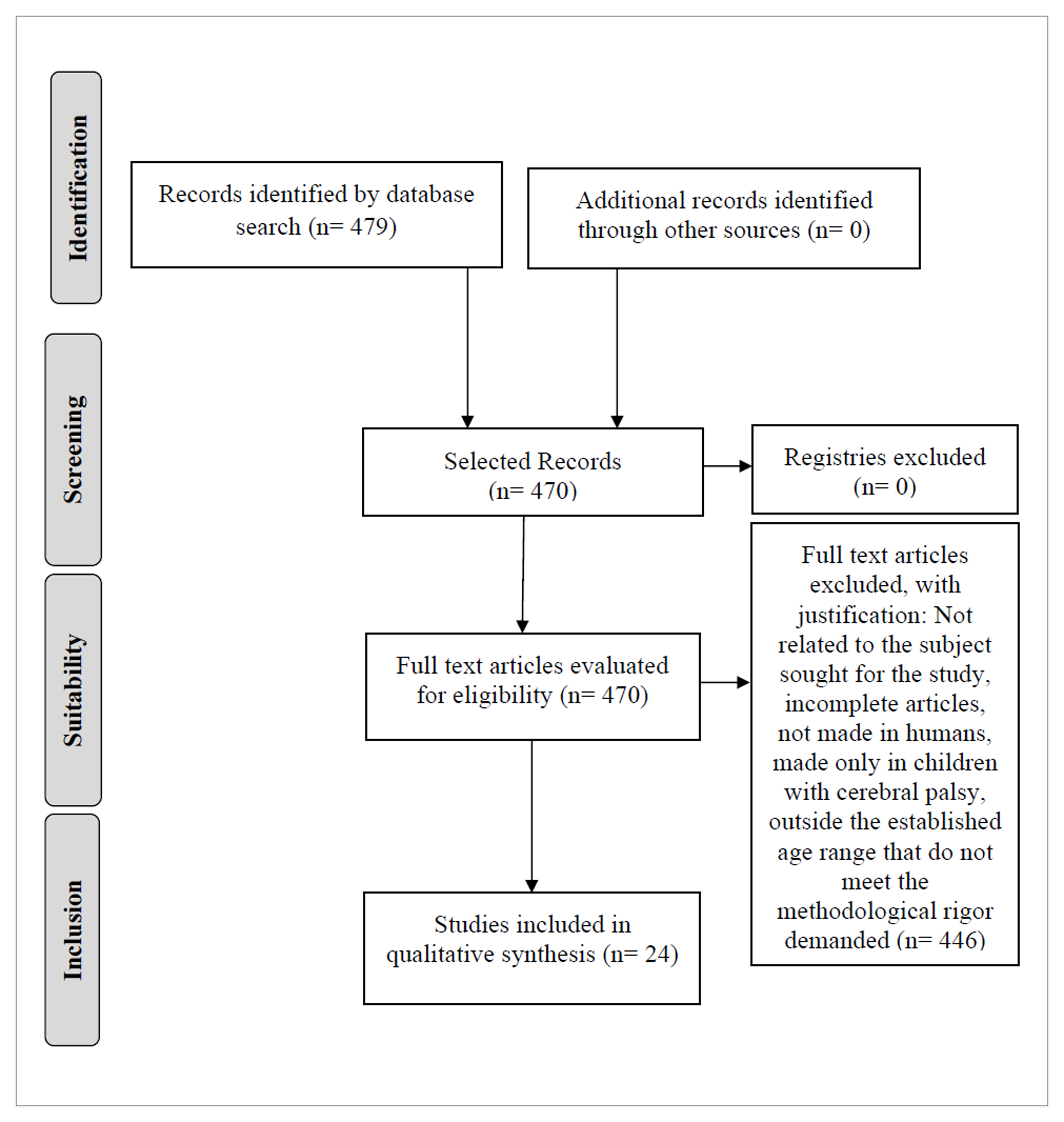 Studies that belonged to some of the following categories were excluded: studies published in abstract form, not written in English or Spanish, which also do not comply with the formality or rigor for the study, with a different methodological design from the one sought in this study, research, interventions not carried out in humans, and that are not related in any way to the subject in question, such as learning without any motor implication, children with cerebral palsy and children who were outside the established age range.