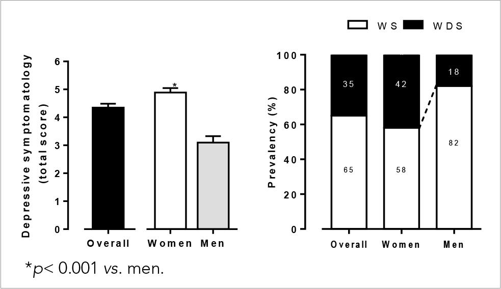 In Figure 1, it is possible to visualise the scores of depressive symptoms as well as the prevalence considering the presence or absence of symptoms. After analysing the scale, the mean total score of the elderly was 4.34± 2.60, reaching a prevalence of 35% of elderly people with depressive symptoms. Statistical differences (p< 0.001) were found after analysis by sex, with 42% of women presenting depressive symptoms with a mean score of 4.88± 2.66 points and 18% of men with 3.10± 2.04 points.