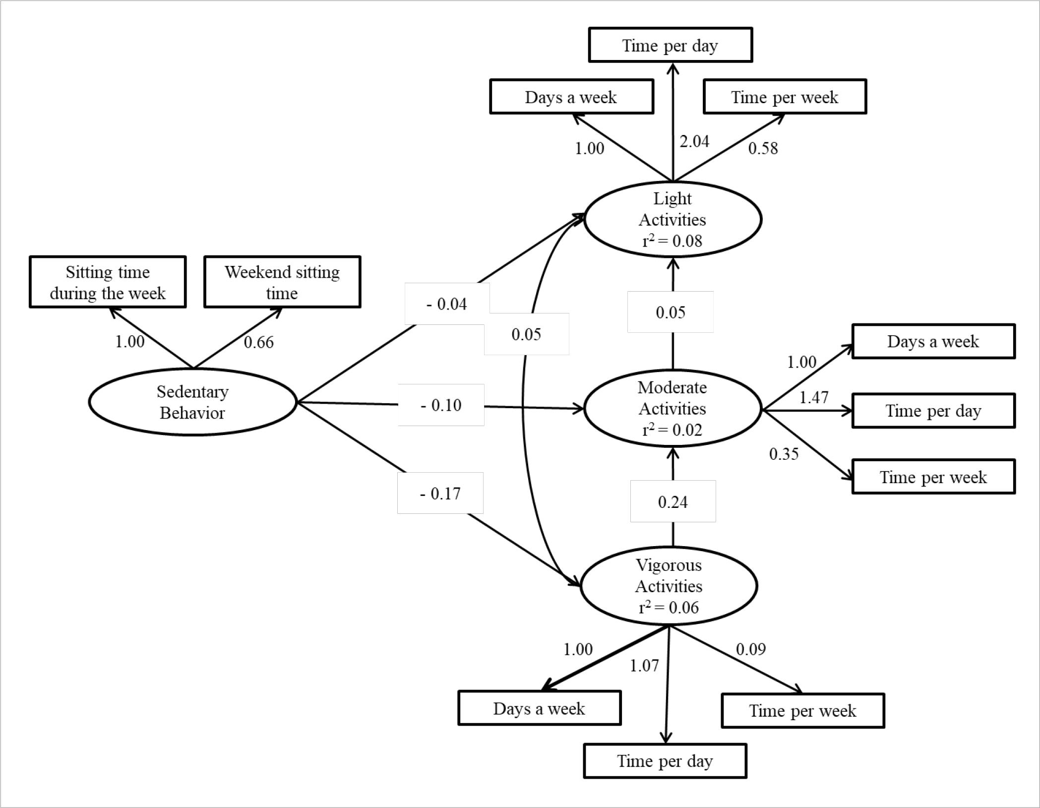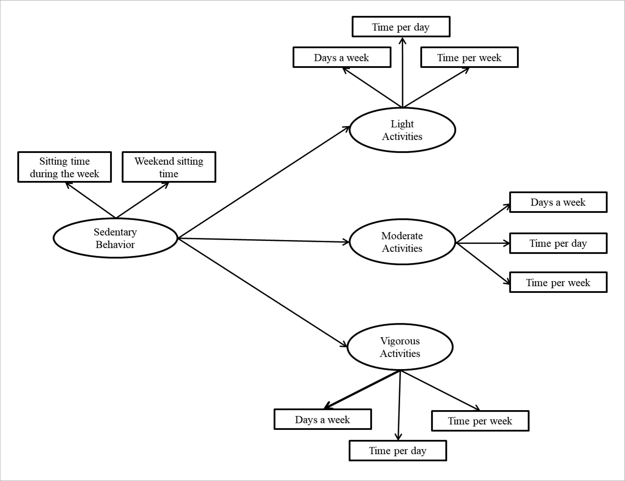In this context, a hypothesised theoretical model was created, considering that sedentary behaviour influences the practice of light activity, moderate activity and vigorous activity (Oliveira et al., 2018). In this model, the variables sedentary behaviour, light activity, moderate activity, and vigorous activity were treated as constructs. The sedentary behaviour construct was defined by the variables time sitting during the week and time sitting on the weekend; the light, moderate and vigorous activities construct was defined as days per week, time per day and time per week (Figure 1).