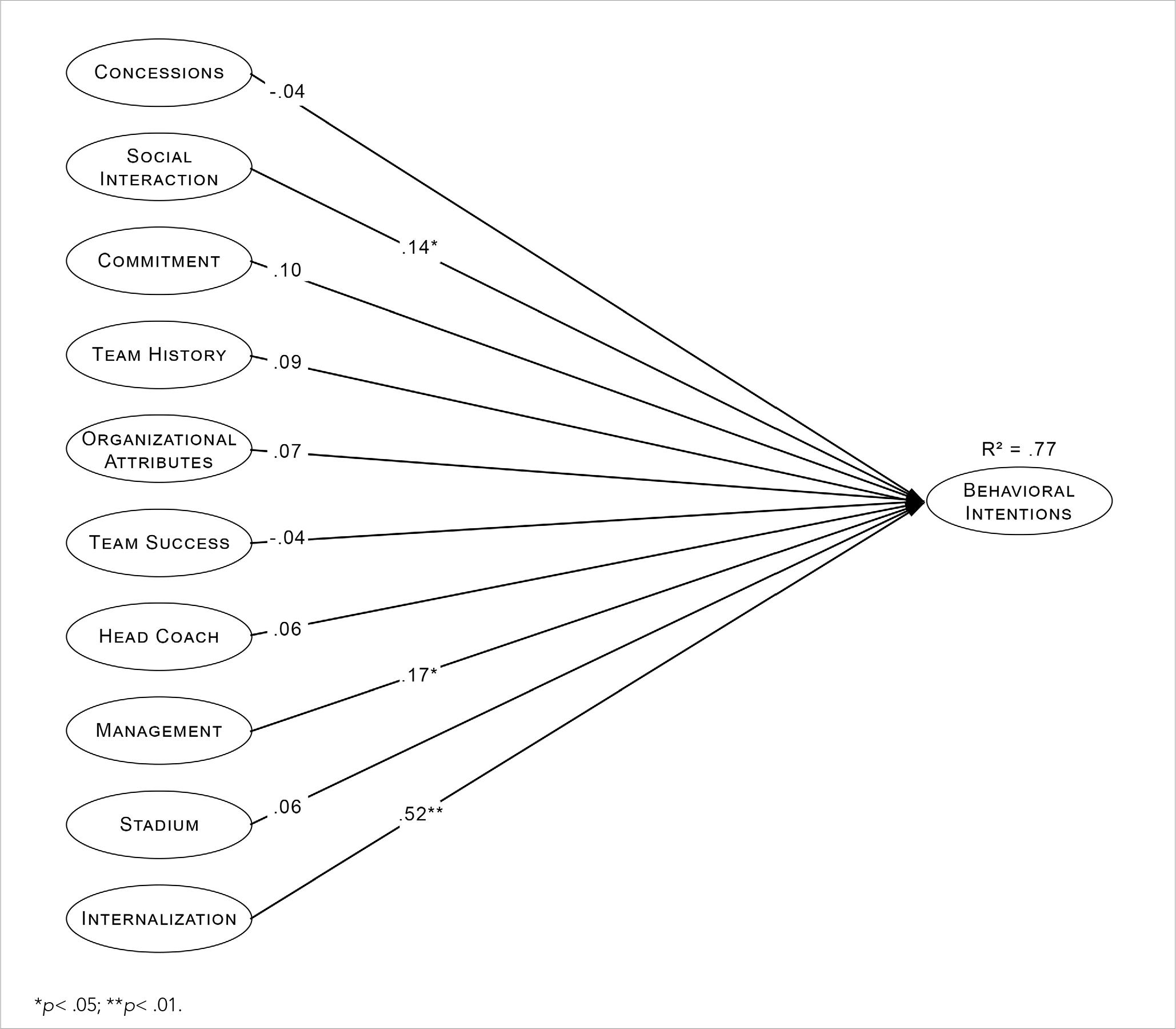The analysis of the measurement model and the causal model presented identical values, demonstrating good adjustment [χ2 (440)= 939.05 (p< .001), χ2 / df= 2.13, TLI= .93, CFI= .94, GFI= .88, RMSEA= .05 (95%CI .047–.057)]. Figure 1 shows the paths of the causal model. The analysis of these trajectories revealed that the dimensions internalisation, social interaction, and management had a significant positive effect on the behavioural intentions of the fans. Finally, the dimensions of brand equity were responsible for explaining 77% of the total variance in behavioural intentions (R2= .77).