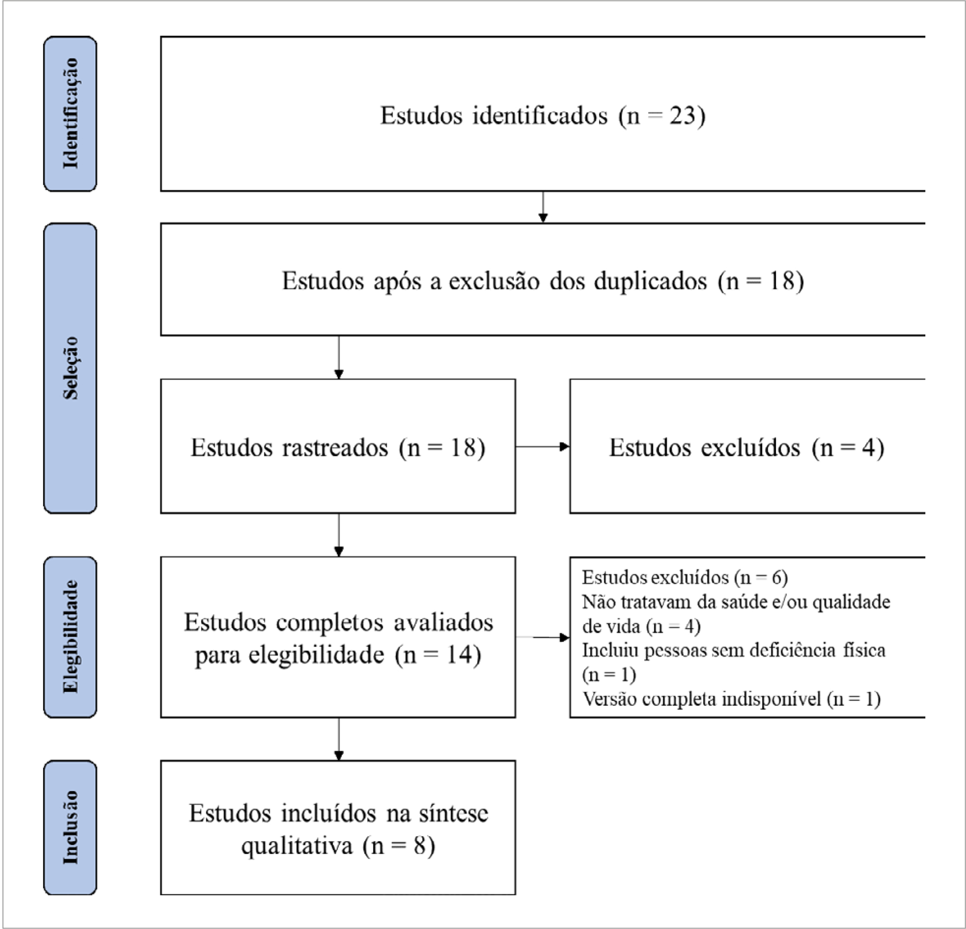 Em relação aos critérios de elegibilidade, só foram incluídos estudos disponíveis na íntegra, escritos em língua Portuguesa (Brasil), Inglesa (EUA) e/ou Espanhola. Ademais, só foram incluídos estudos que associaram a prática da DCR à saúde e qualidade de vida. Por outro lado, foram excluídos os estudos que não incluíram pessoas com deficiência física. Ademais, não foi estabelecido restrição de tempo para seleção dos estudos.