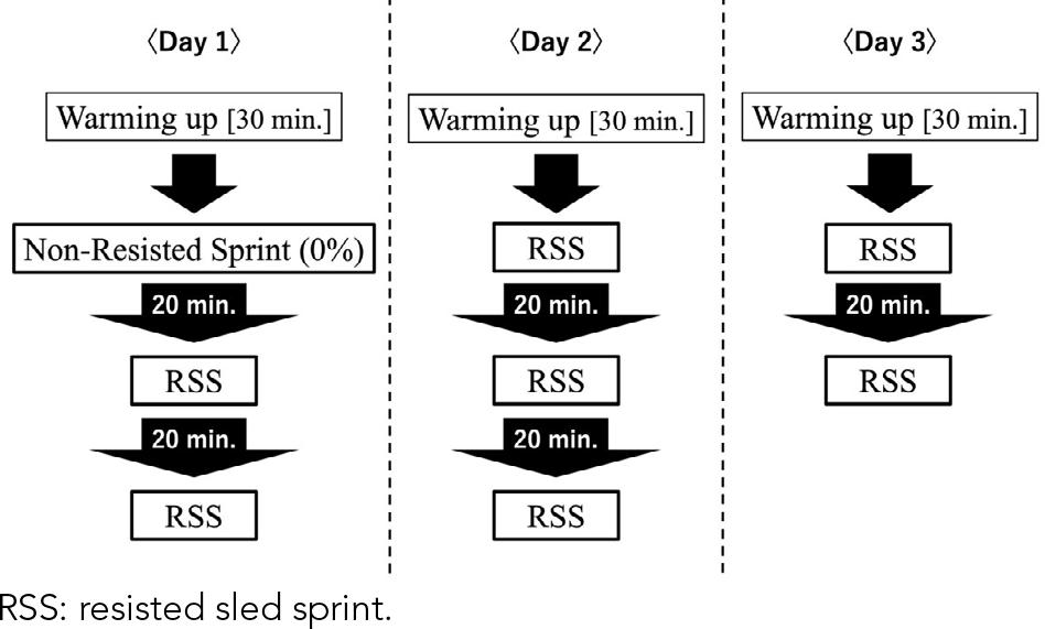 Loads were individually set based on the participants’ BM measured prior to the study using the Fit Scan FS-E01 scale (Tanita, Tokyo, Japan). BM was rounded to one decimal place, and the following eight loads were used: no load (0%BM) and seven loads in 10% increments from 20% to 80%BM. The weight of the training sled (Training Sled, Lindsports, Osaka, Japan) used for the RSS was 12 kg. When heavier weights were evaluated, weight-training plates were used and adjusted in 1.25-kg increments; all participants first performed a no-load sprint (0%BM) test. To eliminate order effects on performance, loads for subsequent tests were randomly selected, and all loads were evaluated via the RSS.