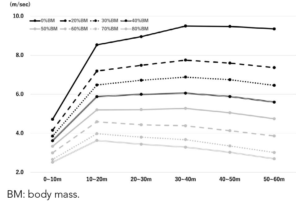 The velocity of cyclical movements that involve the repetition of similar actions—such as running (Mero et al., 1992) or swimming (Craig Jr. & Pendergast, 1979)—is calculated as the product of the frequency of movement per unit time (step frequency), and distance travelled in a single movement (step length). Zabaloy et al. (2022) reported that in RSS with loads of 10–50%BM, step length decreased with increasing loads, but step frequency did not. Conversely, Lockie et al. (2003) reported that step frequency and step length in RSS decreased with loads of 12.2 and 32.2%BM when compared with 0%BM load. Furthermore, step length decreased with increasing load, while step frequency did not change. In the present study, both step frequency and step length decreased significantly for 20–80%BM loads when compared with 0%BM load. However, step length decreased with increasing load, whereas step frequency decreased with increasing load from 0%BM to 70%BM with no significant difference between 70%BM and 80%BM. In the present study, the results were inconsistent with previous studies in step frequency and step length from 0%BM to 70%BM. The phase of maximum running velocity was the same at 0-50% BM, but the phase of maximum step length differed at 0-30% BM and 40-50% BM. It was suggested that the ratio of step frequency and step length differed according to RSS loads. This ratio between step frequency and step length is unique to each individual and automatised (Schiffer, 2010) but may be changed by RSS loads. This characteristic of each load is an important point for coaches and athletes to consider when conducting RSS in training. For example, if you aim to run close to a normal run (0% BM) during RSS, you may want to avoid using loads above 40% BM.
