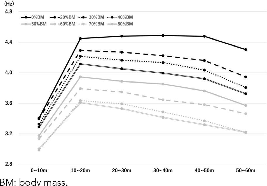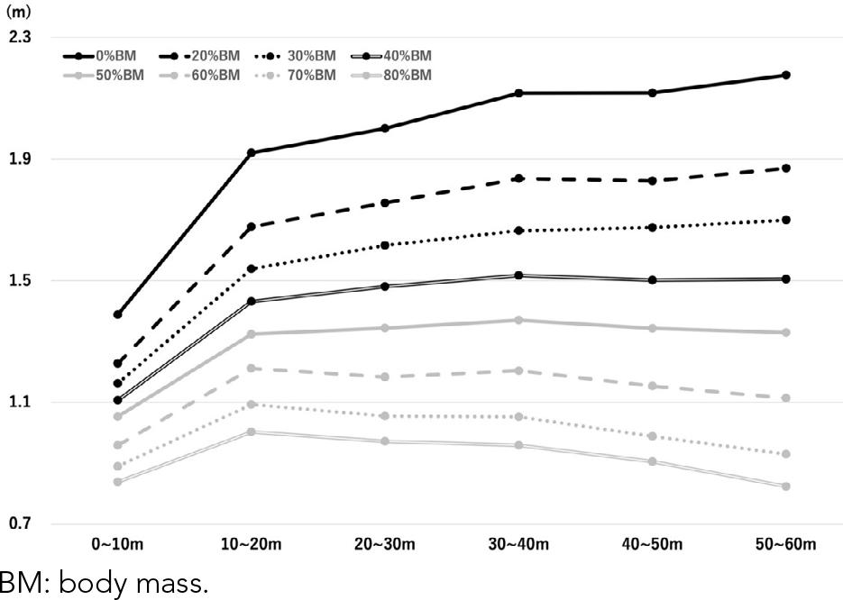 The phases of maximum step length were the 50–60-m phase for 0–30%BM, the 30–40-m phase for 40–50%BM, and the 10–20-m phase for 60–80%BM. Step length was maintained in the 30–50-m phase for 0% and 20%BM, in the 30–60-m phase for 30%BM, in the 20–60-m phase for 40%BM, in the 10–60-m phase for 50%BM, in the 10–30-m and 30–60-m phases for 60%BM, and in the 10–40-m phase for 70% and 80%BM (p= 0.12–1.00, d= 0.00–0.53).