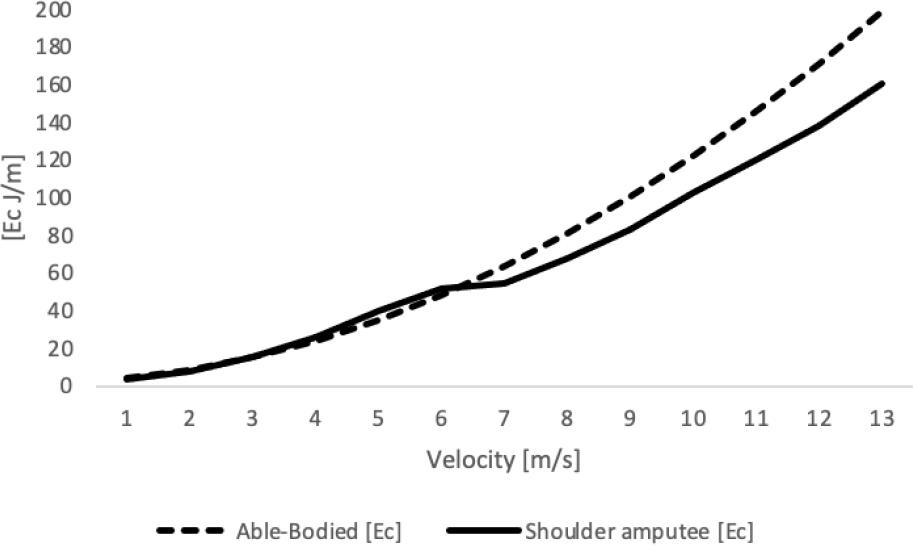 The Ec varied between 4.13 and 198.60 J/m for the able-bodied and 3.88 and 160.42 J/m for the shoulder amputee. Figure 2 depicts the energy cost of an able-bodied and a shoulder amputee cyclist.
