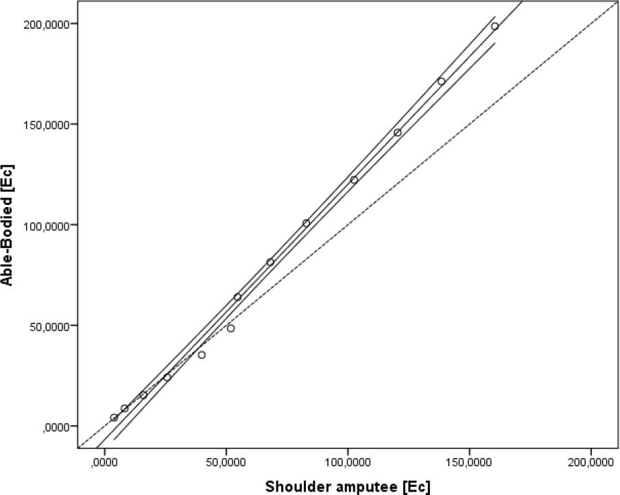 The trend line equation (Y= -6.735 + 1.269x) between methods was above the reference line (Y= x), as presented in Figure 3. Additionally, it was possible to observe that the able-bodied overestimates the shoulder-amputee Ec.