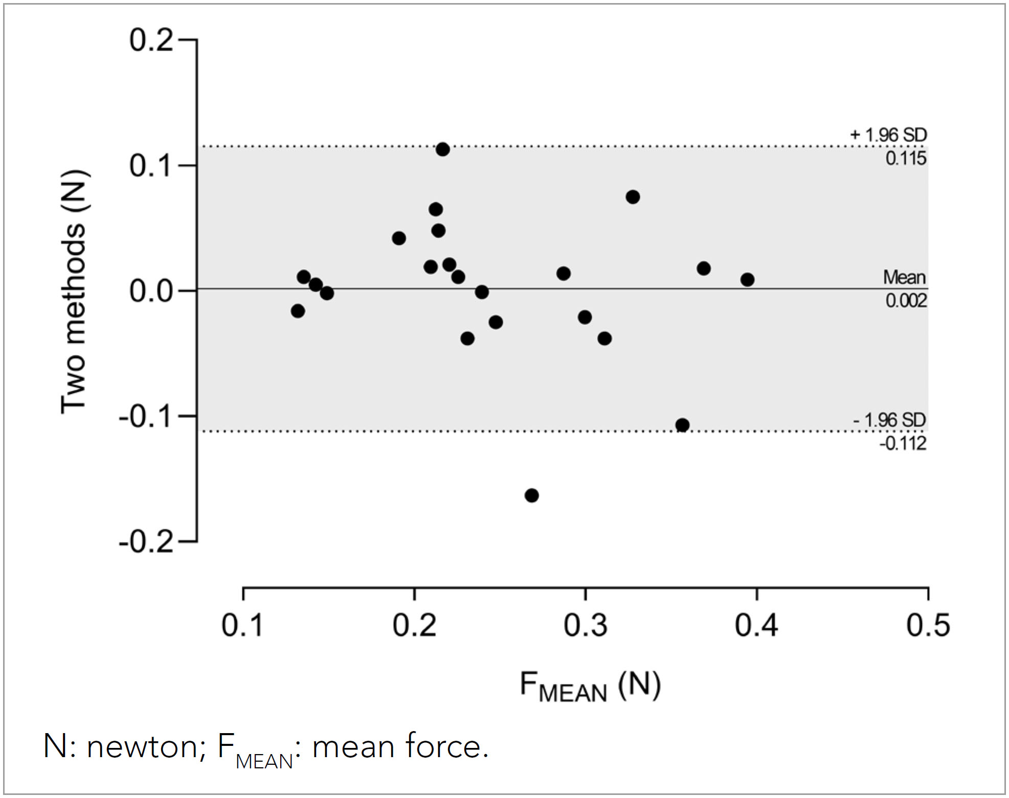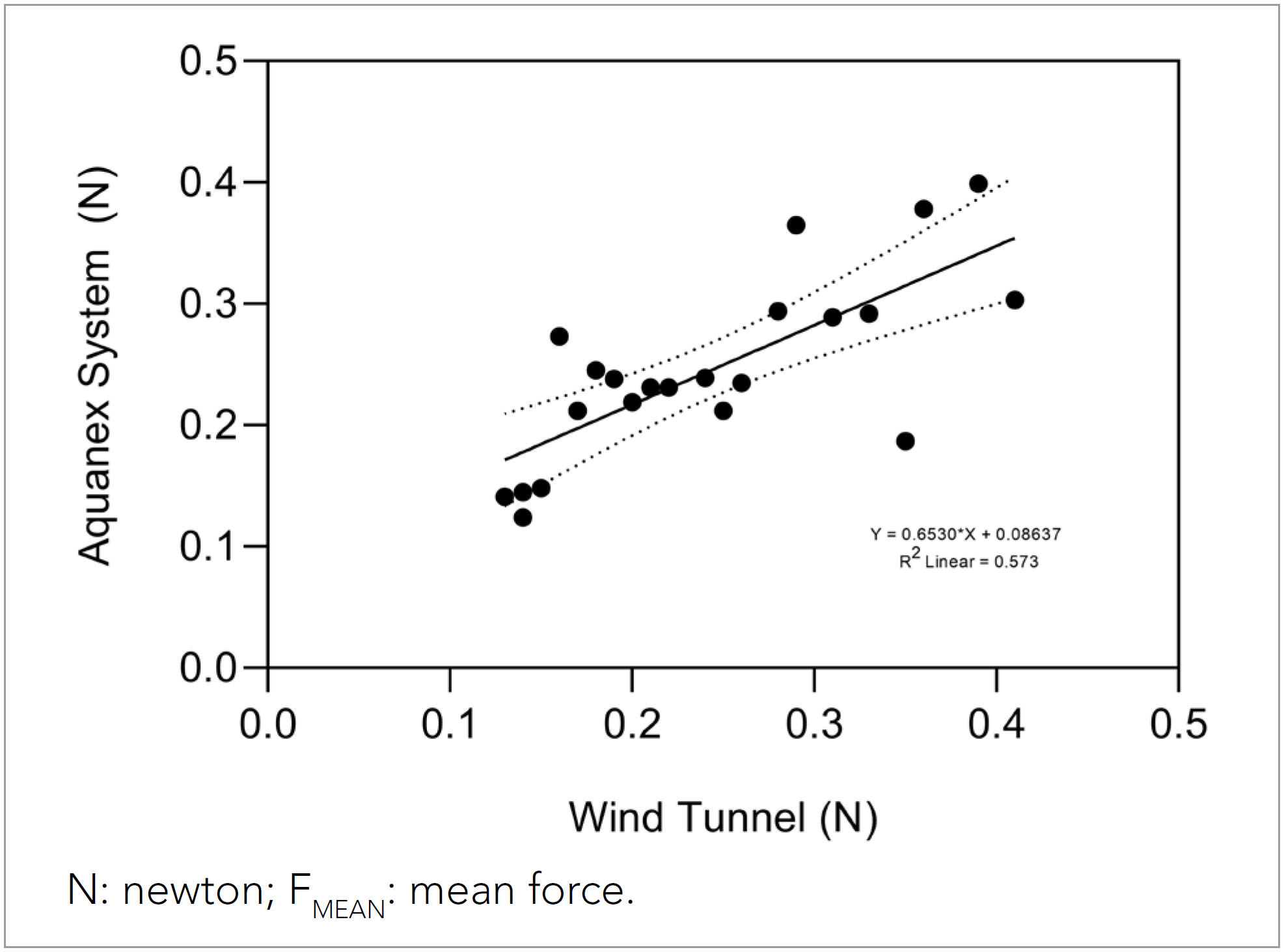 No differences in FMEAN were found when comparing the Aquanex System and the Wind Tunnel (Aquanex System: 0.250± 0.087 N, Wind Tunnel: 0.244± 0.086 N; p= 0.884). Linear regression models between both methods showed significant relationships with a high effect (R2= 0.573, p< 0.001) for FMEAN (Figure 2). The Bland-Altman method revealed that 95.5% of the plots (i.e., more than 80%) were within the upper and lower LoA (Figure 3), and the bias was small (0.002 N).