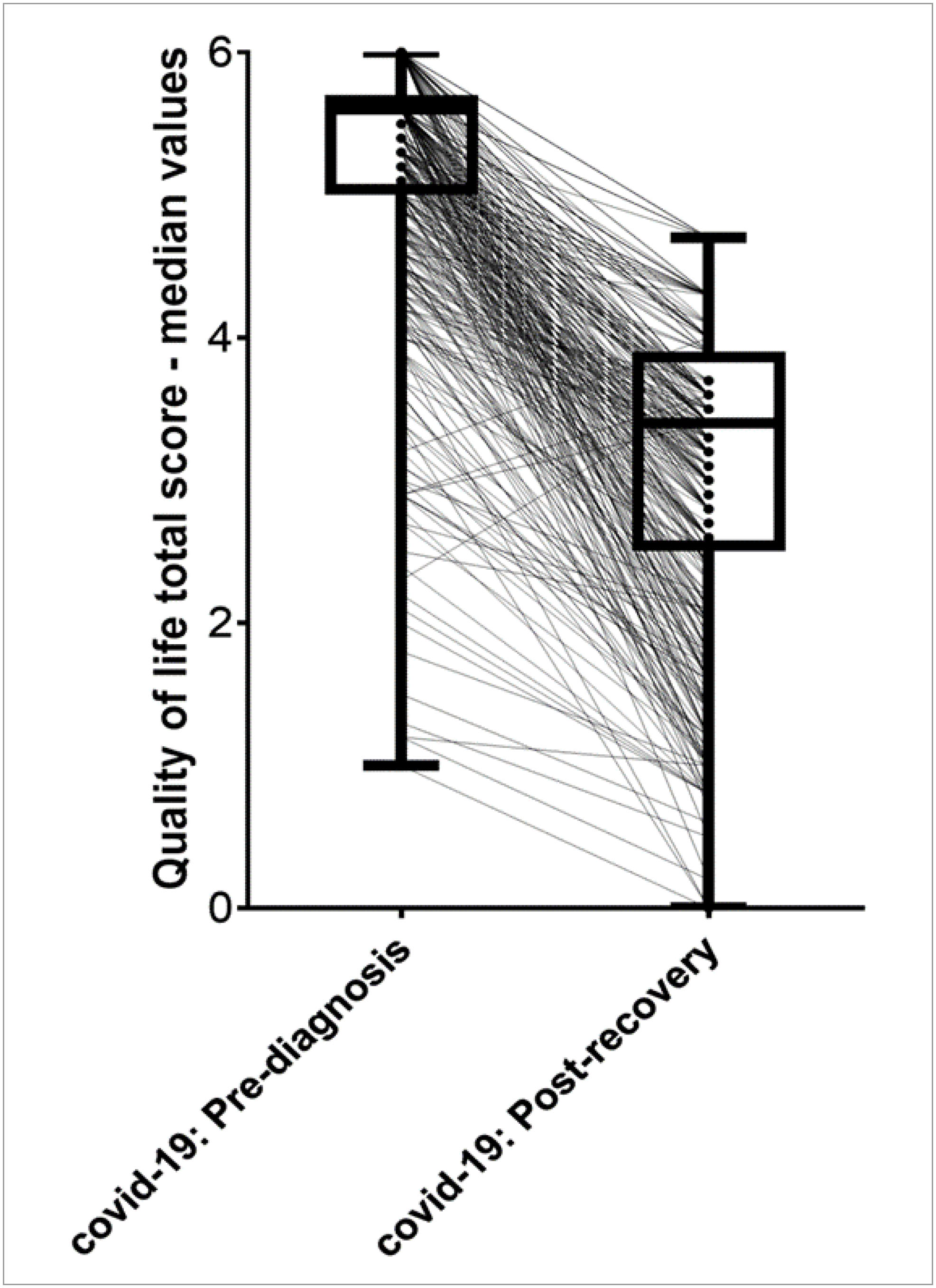 This trend mentioned above is confirmed in Figure 1, where a reduction (2.2 points) in the median value of the total quality of life score was observed in the comparison between the pre-diagnosis (5.6 points) and post-recovery (3.4 points) COVID-19 periods (Z= −19,589; p< 0.001). In addition, the minimum and maximum values (1.0–6.0; 0.0–4.7) and 25th and 75th percentiles (5.0–5.6; 2.5–3.4) were observed in the pre-diagnosis and post-COVID-19 recovery periods, respectively. Additionally, the effect size of the impact of COVID-19 on quality of life was classified as large (d= 0.87).