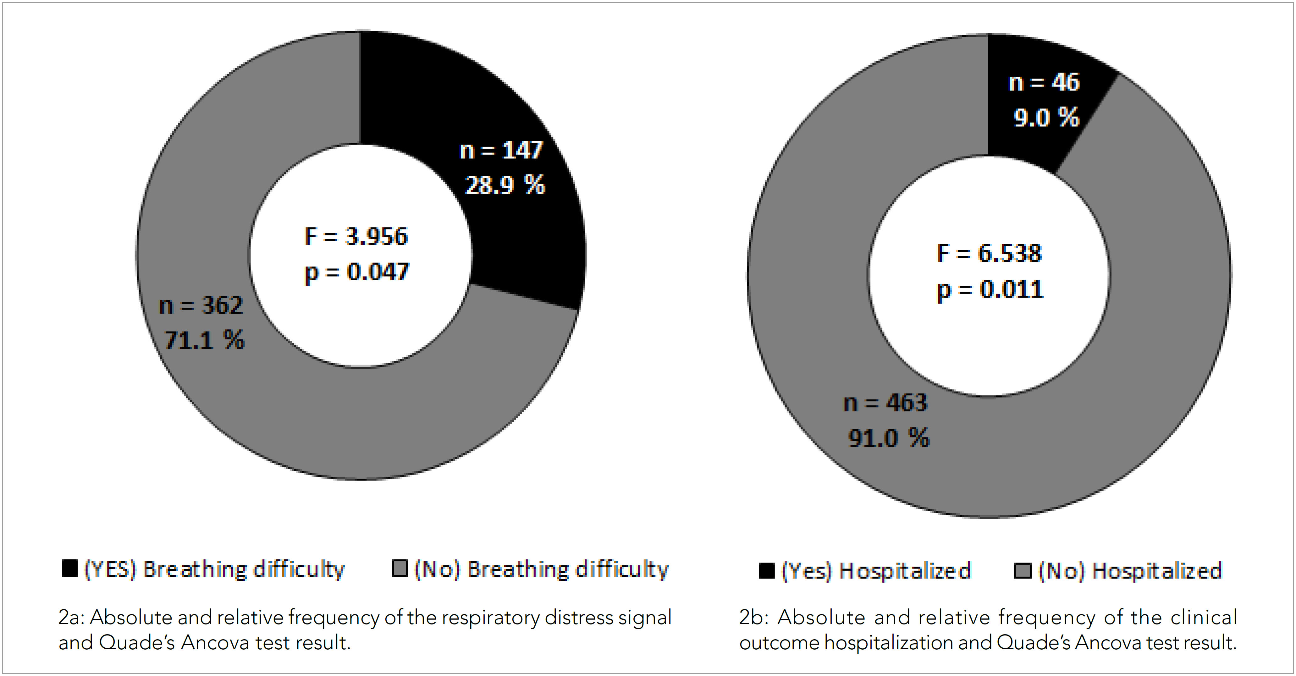 Figure 2 (A) Absolute and relative frequency of the respiratory distress signal, (B) the clinical outcome of hospitalisation, and the result of the Quade's Ancova test of people diagnosed with COVID-19. Ribeirão Preto, 2022.