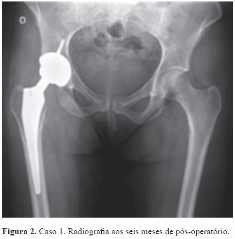 Foi internada por Obstetrícia para realização de cesariana de urgência. Uma semana depois a doente foi submetida a artroplastia total da anca direita não cimentada, cerâmica/cerâmica (Figura 2).