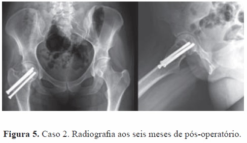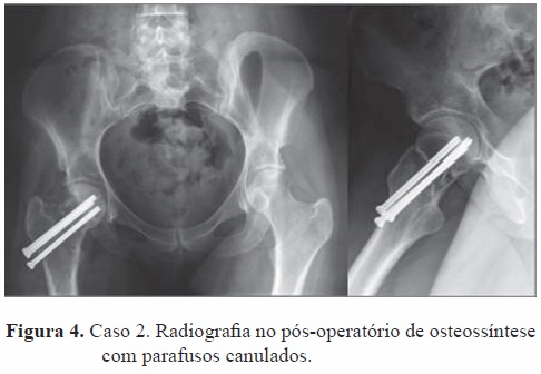 Quanto ao 2º caso a opção cirúrgica pela osteossíntese pode ser discutível porque a fixação foi realizada com mais de 48h após a fratura e a doente apresentava já uma lise importante ao nível do foco de fratura, por carga desprotegida. Estes são dois factores que contribuem fortemente para o risco de necrose avascular da cabeça femoral. A fixação da fratura foi realizada após uma manobra de redução na mesa ortopédica em rotação interna e abdução, sem abordagem do foco de fratura.