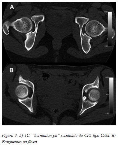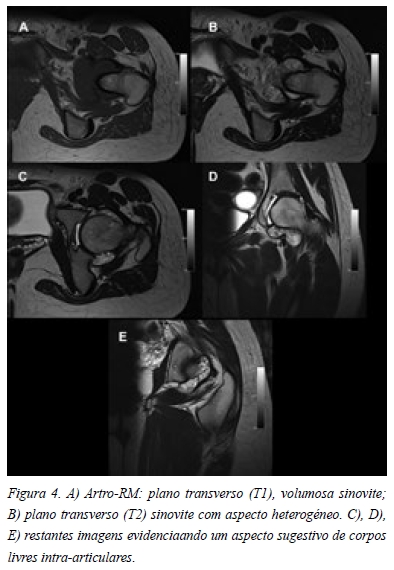 Na radiografia em incidência antero-posterior da bacia era possível observar uma flexão pélvica acentuada, o que condicionava uma falsa proeminência das espinhas isquiáticas e secundariamente uma retroversão focal (Figura 1 A). Também apresentava uma pequena perda de “offset” do colo à esquerda (Figura 1 A). Outros aspectos merecedores de atenção eram uma imagem de elevada densidade na fóvea (Figura 1 B) e o aumento da interlinha articular à esquerda (Figura 1 C). Na incidência de “cross table lateral” da anca esquerda também era possível observar a perda de “offset” do colo, apresentando um ângulo alpha de 69,3º (Figura 2). Nenhuma das incidências apresentava imagens características de condromatose sinovial. A paciente também trazia uma TC que revelava um “herniation pit” provavelmente relacionado com o conflito femoro-acetabular tipo CAM (Figura 3 A) e duas imagens invulgares na fóvea, compatíveis com corpos livres, mas sem origem identificável (Figura 3 B). A artro-RM apresentava uma volumosa sinovite na ponderação em T1 (Figura 4 A) e um aspecto heterogéneo em T2 (Figura 4 B), que se mantinham nos restantes cortes e que poderiam ser sugestivos de corpos livres (Figura 4 C, D, E). Sem outras imagens sugestivas de lesão labral ou cartilagínea.