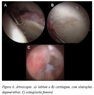 A hipótese diagnóstica colocada foi de condromatose sinovial primária. Desta forma a paciente foi proposta para artroscopia da anca com carácter diagnóstico e terapêutico. Iniciámos o procedimento pelo compartimento central utilizando o portal antero-lateral (visualização e trabalho) e médio-anterior (visualiazação e trabalho) sendo possível observar vários condromas no fundo acetabular (Figura 5A). Posteriormente realizou-se o portal póstero-lateral com intuito de assegurar a remoção de todos os corpos livres da porção posterior do compartimento central (Figura 5B). No compartimento periférico procedeu-se à libertação e remoção dos condromas aderentes à sinovial (Figura 5C). Para melhorar o acesso à porção antero-inferior do colo femoral tivemos necessidade de realizar o portal anterior, com intuito de remover o maior número possível de condromas (Figura 5 D, E). O objectivo final foi a remoção de todos os condromas identificáveis (Figura 5 F, G). Constatou-se um labrum degenerado, mas estável (Figura 6 A) e uma cartilagem acetabular com lesões grau II de Outerbridge (Figura 6 B). De seguida procedeu-se a osteoplastia femoral (Figura 6 C). O exame histológico confirmou o diagnóstico.