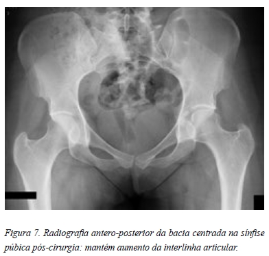 No seguimento pós-operatório observou-se uma melhoria clínica progressiva. O NAHS aos 3 meses era de 73,75 e aos 6 e 12 meses de 87,5. De momento, a paciente não apresenta qualquer recidiva da sintomatologia prévia. De ressalvar a persistência do aumento da interlinha articular (Figura 7).