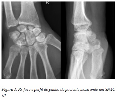 Radiologicamente apresentava uma pseudoartrose do escafóide associado a artrose radioescafoideia e escafocapitato, classificando-se como SNAC III (Figura 1).