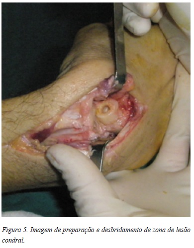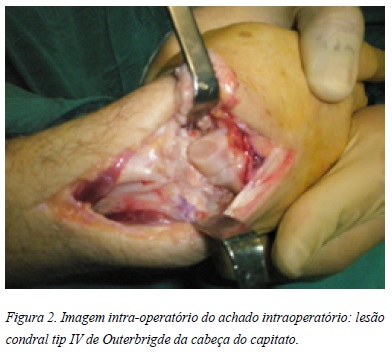 Constatou-se, durante a intervenção cirúrgica, a presença de uma lesão condral tipo IV de Outerbridge da cabeça do capitato, ocupando todo o quadrante central, radial e dorsal com área de aproximadamente 5 x 7 mm. A fossa semilunar encontrava-se íntegra (Figura 2).