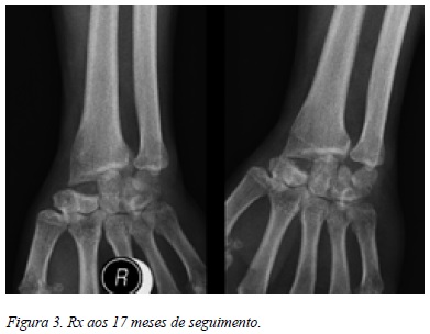 Com um seguimento de 13 meses, apresenta uma EVA de 2 pontos, amplitude de movimento combinado do punho de 60o, força de preensão de 28 kg e retomou as atividades de vida diária sem queixas. Radiologicamente não apresenta sinais de artrose radiocárpica e verificou-se integração do enxerto (Figura 3).