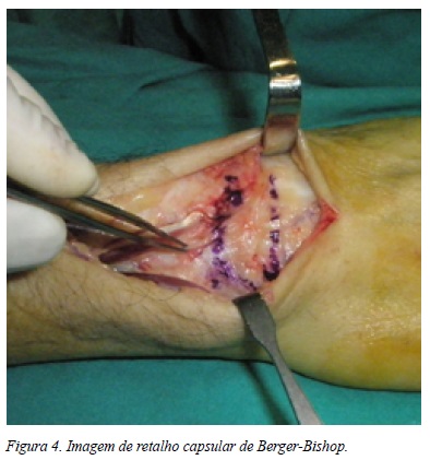 A cápsula articular é abordada com um retalho trapezoidal de base radial utilizando como referências o ponto médio entre o tubérculo de Lister e a fossa semilunar, a tuberosidade do piramidal e o intervalo entre o escafoide, trapézio e trapezoidal, conforme preconizado por Berger6,13. O retalho apresenta um ramo proximal justa-radial, um obliquo entre os primeiros dois pontos de referência e um ramo distal transversal entre a tuberosidade do piramidal e o último ponto de referência (Figura 4). Essa abordagem permite a preservação dos ligamentos radiocárpico e intracárpico dorsais, mantendo assim estruturas fundamentais da estabilização do punho6,13.