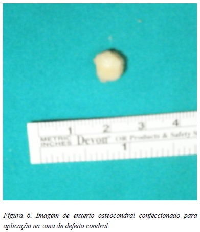 O cilindro condral é colhido do semilunar ou piramidal com brocas de mosaicoplastia ou através de simples confeção e regularização com pinça goiva. É realizada uma regularização dos bordos e fundo da lesão com broca, em direção perpendicular à superfície condral (Figura 5). O enxerto é aplicado à mão e com percussão suave de martelo prevenindo a lesão condral do enxerto. De notar que não é necessário que as dimensões do enxerto preencham completamente a superfície da lesão, evitando assim uma lesão da cartilagem periférica do capitato e do próprio enxerto se a sua introdução decorre com uma fricção/contacto sob grande pressão. Consideram-se toleráveis lacunas até 2 mm (Figuras 6 a 7).
