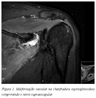 A compressão pode também acontecer na goteira supraescapular ou na chanfradura espinoglenoideia por um mecanismo direto, como seja a presença de um tumor dos tecidos moles, um tumor ósseo, uma malformação vascular, ou mesmo um quisto secundário a lesão capsular ou do labrum (Figuras 2 e 3).