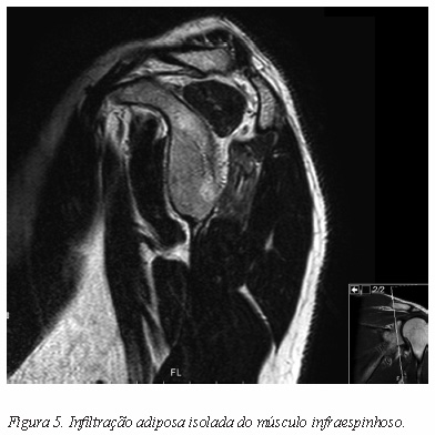 A ressonância magnética (RM) é o exame ideal para visualizar o trajeto do nervo bem como identificar massas ou outras lesões ocupando espaço32-34. Permite excelente avaliação do labrum, quistos associados, tendões da coifa dos rotadores e qualidade dos músculos, incluindo a infiltração adiposa e a atrofia35 (Figura 5).
