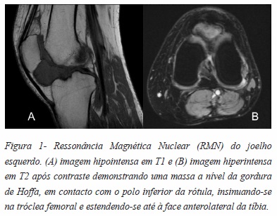 As radiografias realizadas não apresentavam alterações. Dada a hipótese diagnóstica de eventual lesão do corno anterior do menisco externo associada a tendinite do tendão rotuliano, o doente realizou uma Ressonância Magnética Nuclear (RMN) que revelou uma massa bem circunscrita, lobulada, com 5x3,9x2,8cm, globalmente heterogénea, hipointensa em T1 e T2, hiperintensa em T2 após supressão de gordura e administração de contraste. A massa encontrava-se a nível da gordura de Hoffa, em contacto com o polo inferior da rótula, insinuando-se na tróclea femoral e estendendo-se até à face anterolateral da tíbia, em contacto direto com o tendão rotuliano (Figura 1).