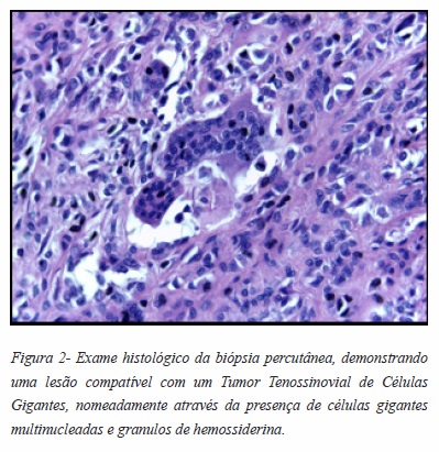 Foi realizada uma biópsia aspirativa por agulha fina ecoguiada que revelou tratar-se de uma lesão compatível com um Tumor Tenossinovial de Células Gigantes (Figura 2).