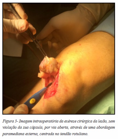 Dada a localização, optou-se pela exérese cirúrgica da lesão por via aberta, através de uma abordagem paramediana externa, centrada no tendão rotuliano.