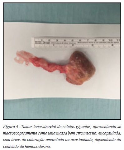 Caracterizam-se histologicamente por apresentarem hiperplasia das células sinoviais, células gigantes multinucleadas, macrófagos, fibroblastos, células espumosas e depósitos intra e extracelulares com quantidades variáveis de lípidos e hemossiderina7. Dada a sua origem sinovial comum, a variante nodular peri-articular ou das bainhas tendinosas, é considerada a forma extra-articular da Sinovite Vilonodular Pigmentada. No entanto, embora demonstrem características histológicas semelhantes, apresentam comportamentos biológicos e clínicos distintos entre eles3,4. As variantes nodulares são geralmente indolentes e de melhor prognóstico, já as variantes difusas, são localmente agressivas, apresentando taxas mais elevadas de recidiva2.