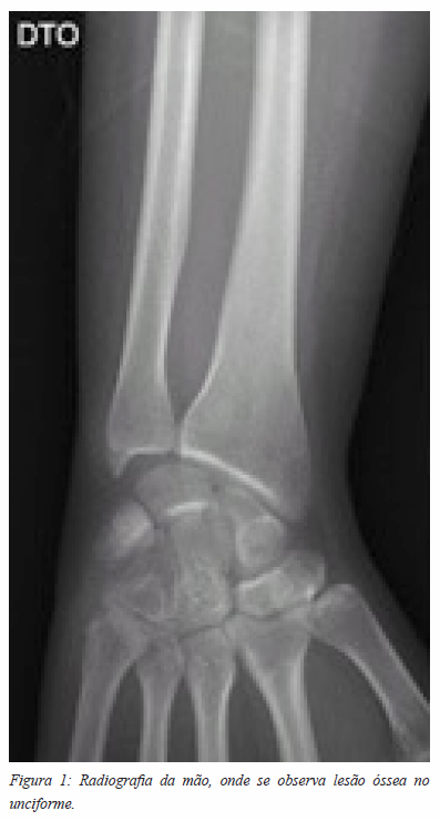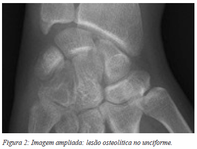 Apresentava radiografia (Figuras 1 e 2) com lesão lítica do unciforme, com esclerose dos bordos, sem disrupção da cortical, que ocupava cerca de 30% do osso. Foi pedida uma TC, que revelou uma lesão ocupando espaço do unciforme.