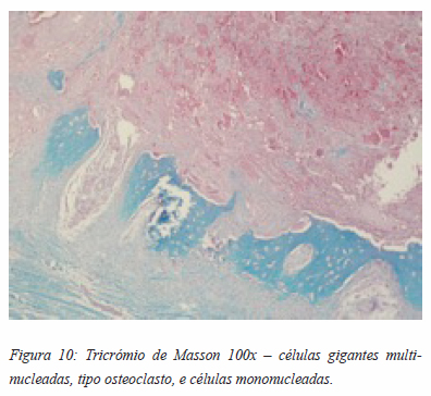 O que diferencia o tumor de células gigantes do osso é a presença de células gigantes multi-nucleadas, tipo osteoclasto, e células ovais mononucleares, que correspondem ao componente proliferativo do tumor, uniformemente distribuídas11. Necrose, hemorragia, deposição de hemossiderina e formação de osso reativo são frequentes10. A presença de células gigantes tipo osteoclasto e células mononucleares foi o fator que levou ao diagnóstico de tumor de células gigantes no caso apresentado. No entanto, estas células podem estar presentes noutros tipos de tumor, como o osteoma osteoide, o osteoblastoma ou mesmo o osteossarcoma, dificultando o diagnóstico do patologista, salientando-se a importância do relacionamento dos dados histológicos com os clínicos e imagiológicos.