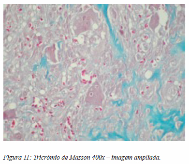O exame anatomo-patológico apresentava células gigantes multinucleadas, tipo osteoclasto e células mononucleadas, com ligeiro pleomorfismo e raras mitoses (figura 10 e 11), aspetos que apontam para um tumor de células gigantes do osso. Seis meses após a cirurgia, a doente não apresenta sinais de recidiva da doença, e mantém a amplitude de todos os movimentos do punho, não tendo sido medida objetivamente a força de preensão.