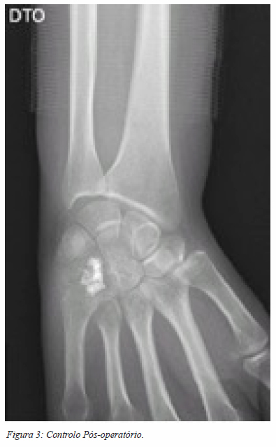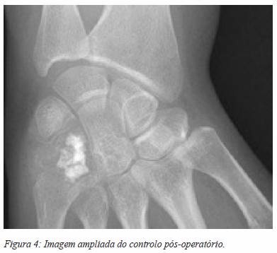A hipótese diagnóstica, pela aparente não agressividade da lesão e dada a elevada prevalência, era a de um encondroma. Foi submetida a cirurgia de remoção da lesão. Por via dorsal, foi curetada a lesão com colocação de enxerto esponjoso de ilíaco e fosfato de cálcio. A recuperação decorreu sem intercorrências, com recuperação progressiva da mobilidade do punho. O controlo radiográfico da cirurgia está ilustrado nas figuras 3 e 4.
