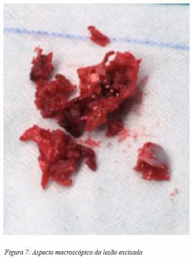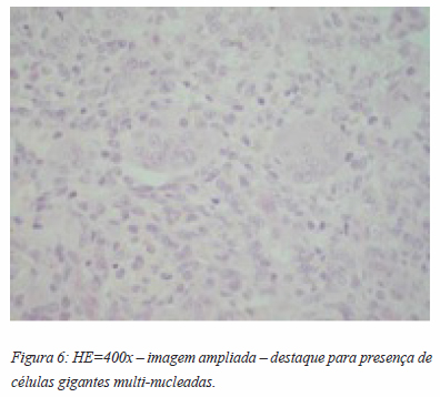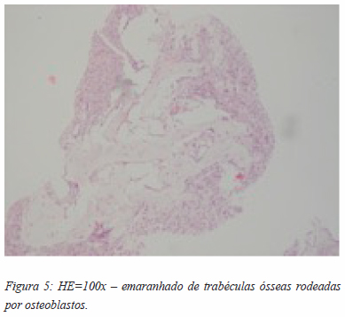 Foi enviada a peça para exame anatomo-patológico, sendo o resultado compatível com osteoma osteoide do unciforme, pela presença de emaranhado de trabéculas ósseas rodeadas por osteoblastos (figura 5). No entanto, apresentava também células gigantes multi-nucleadas (figura 6).