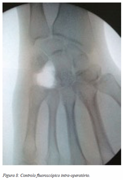 No dia 12 Março 2015 é submetida a exérese em bloco do tumor ósseo recidivado do unciforme direito e preenchimento do espaço com hemitendão do grande palmar (figuras 7, 8 e 9). Optámos pelo hemitendão do grande palmar porque intra-operatoriamente verificámos que a doente tinha uma variante anatómica do normal e não apresentava o músculo pequeno palmar que seria, em condições normais, a nossa primeira opção para fazer a almofada biológica.