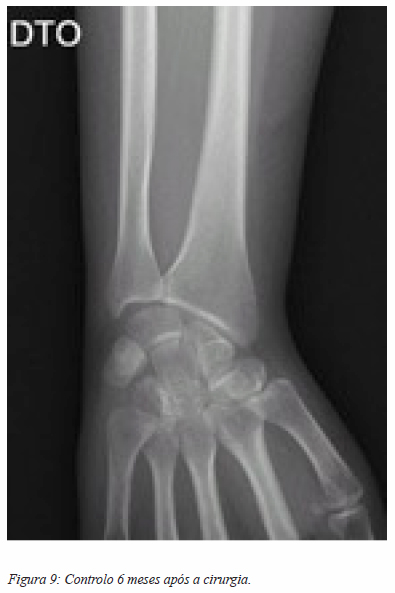Neste momento, temos 6 meses de seguimento da doente, e esta não apresenta qualquer sinal de recidiva local da lesão, sendo que clinicamente a doente apresenta força e mobilidade do punho e mão normais.