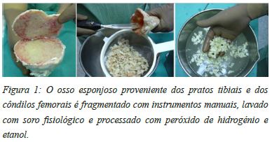 Os enxertos ósseos são obtidos em dadores humanos não vivos no decurso das colheitas multiorgânicas. Usando serras pneumáticas, goivas e escopros goivos manuais, os pratos da tíbia e os côndilos femorais do mesmo dador, são talhados por forma a obterem-se, apenas, fragmentos de osso esponjoso com as dimensões entre 7-10 mm (Figura 1). Com a intenção de remover a gordura, sangue, medula óssea e membranas celulares, os fragmentos ósseos são abundantemente lavados e imersos em soro fisiológico, são processados usando soluções de peróxido de hidrogénio e de etanol a 70º sendo, no final, criopreservados a uma temperatura de -80ºC.