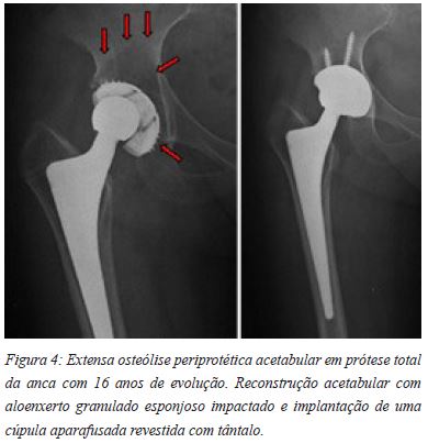Uma vez cumpridos estes procedimentos, as perdas de substância óssea acetabulares são preenchidas com os enxertos granulados usando a técnica da impactação. Primeiro são preenchidas as pequenas lises ósseas cavitárias, depois os enxertos são vigorosamente impactados com impactores manuais convencionais e com o martelo, camada sobre camada, por forma a reforçar as paredes acetabulares. Em seguida, reimplantamos uma cúpula cimentada diretamente sobre o enxerto, ou num anel metálico de reconstrução acetabular aparafusado ou, então, numa armadura acetabular aparafusada, consoante cada situação clínica. Outra técnica, que temos vindo a usar cada vez mais, é a reimplantação de uma cúpula de revisão de tântalo sobre o osso esponjoso impactado. Naturalmente que estes diferentes tipos de reconstruções acetabulares e diversos tipos de implantes, estão condicionados pelas dimensões e morfologia das lises ósseas acetabulares, bem como pela experiência e convicções do cirurgião ortopedista.