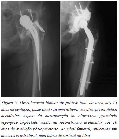 Desta forma, é possível dispor de uma quantidade substancial de aloenxertos provenientes de um só dador, não só do tipo esponjoso como também de aloenxertos estruturais de todos os tipos, formas e dimensões, com as vantagens daí decorrentes. A não ser assim, teríamos que usar várias cabeças femorais provenientes de diferentes dadores vivos, situação que devemos evitar sempre que tal seja possível. Por outro lado, a metodologia descrita facilita a disponibilização de unidades individuais de enxertos esponjosos, não havendo necessidade de libertar um dos elementos da equipa cirúrgica para a sua preparação no decurso da operação cirúrgica. Por último, importa dizer que o protocolo do processamento dos enxertos esponjosos foi validado pelos resultados de estudos experimentais6. Por sua vez, a sua utilização em recolocações de cúpulas acetabulares tem vindo a mostrar, ao longo dos últimos vinte e sete anos, resultados conseguidos (Figuras 4 e 5) no que toca à segurança microbiológica, comportamentos biológico e mecânico dos enxertos7,8.