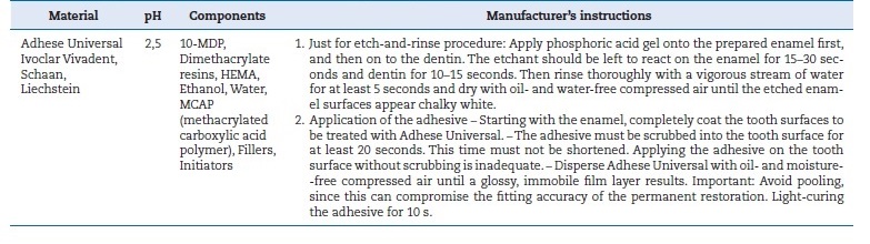 Table 2 Components, composition (information supplied by the manufacturer), and application mode of the tested adhesive.