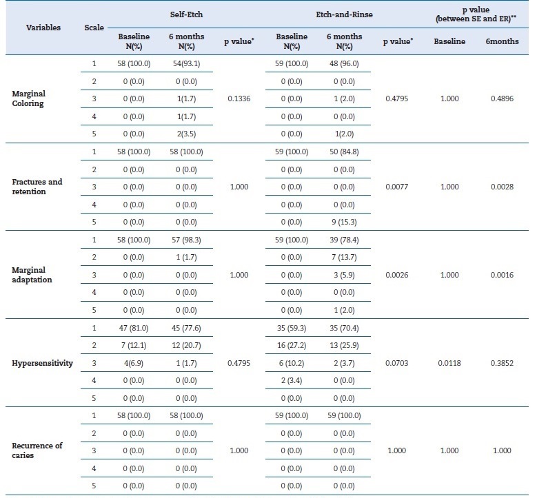 Although significant differences were found in this study with the 6‑month evaluation, it may be interesting to consider a longer follow‑up in future investigations. It would also be important to evaluate this adhesive system’s behavior with the selective‑etch technique, comparing it with the SE and ER techniques, to better evaluate its clinical performance.