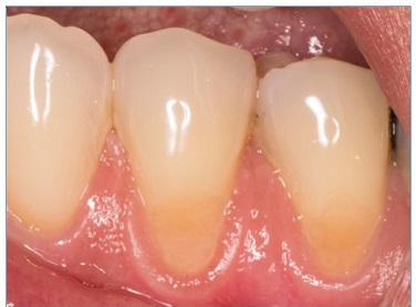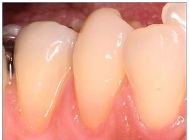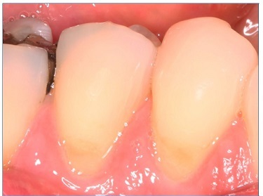 Figure 4 Photographs after 6 months of tooth 44’s restoration by the self‑etch technique and tooth 45’s restoration by the etch‑and‑rinse technique