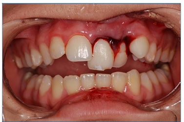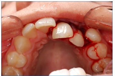 Figure 1 Clinical aspects at the emergency care: intense bleeding in the anterior region of the maxilla involving teeth 11, 12, 21, 22, and 23