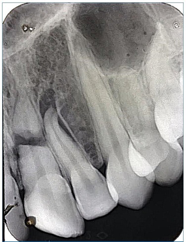 A week later, the patient returned, reporting spontaneous pain aggravated by occlusion followed by pain during palpation on tooth 21 and edema in the region. Pulp necrosis was diagnosed after negative responses to the electrical and cold tests. No periapical lesion was detected. Endodontic treatment was performed following the same protocol used in the treatment of tooth 22. Special care was taken to keep the file tip within the tooth’s coronal fragment to avoid damaging the pulp of the root’s apical fragment. The root canal was dried and permanently filled with a paste of putty consistency composed of calcium hydroxide powder associated with 2% chlorhexidine gel and zinc oxide (S.S. White Artigos Dentarios, Ltda., Rio de Janeiro/RJ, Brazil). The paste was prepared in a 2:1:2 ratio, as proposed by a previous study.17 It was placed in increments with medium and fine‑medium vertical condensers up to the fracture line. Then, the root canal was sealed with composite resin (Z100, 3M, Sumare/SP, Brazil), and an incision was performed in the gingival mucosa to drain the abscess.