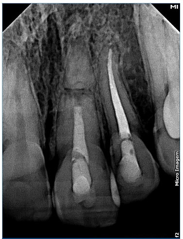 A month later, the patient came back with no signs and symptoms. The splint was removed, and the enamel fracture on tooth 21 was restored with composite resin (Z350, 3M, Sumare/SP, Brazil). One week after removing the splint, the patient returned asymptomatic to complete the endodontic treatment on her tooth 22. The intracanal medication was removed with rotatory instruments under abundant irrigation with 2% chlorhexidine gel and 0.9% saline solution, and irrigation with 17% EDTA for smear layer removal. Subsequently, the root canal was filled with gutta‑percha and Endomethasone N (Septodont, Saint‑Maur‑des‑Fosses, France) as root canal sealer. Lastly, her tooth was sealed with composite resin (Z350 - 3M, Sumare/SP, Brazil).