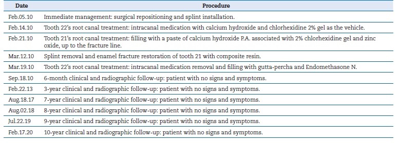 Aside from emergency care and correct diagnosis, long‑term clinical and radiographic monitoring of traumatized teeth is imperative.12 This study presents a long evaluation period where the case’s positive evolution was observed, including total remission of signs and symptoms and no radiographic signs of periapical lesion or root resorption. In addition, after 10 years of follow‑up, teeth 11, 12, and 23 still responded positively to sensitivity tests.