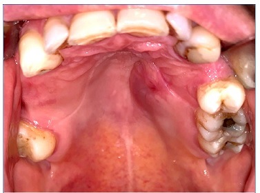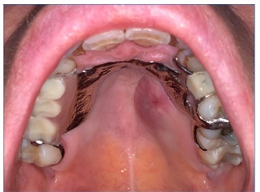 Figura 2 Lesão intra‑ oral localizada no hemi‑palato duro (sem prótese removível esquelética colocada)