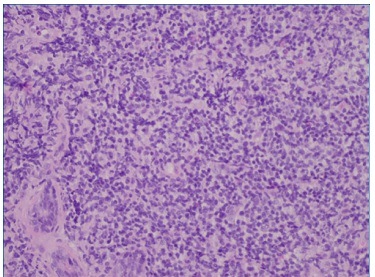 Figura 4 Anatomia patológica da biópsia incisional, revelando existência de glândulas mucosas rodeadas por denso infiltrado de células linfoides com vago padrão nodular