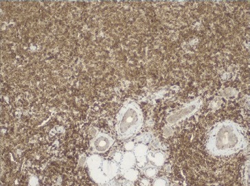 As hipóteses colocadas para diagnóstico diferencial desta lesão apresentadas foram tumores de células salivares (adenoma pleomórfico, carcinoma muco‑epidermoide e adenocarcinoma polimórfico de baixo grau), abcesso de origem dentária/endôntica ou de origem periodontal, e neoplasia linfoproliferativa. Deste modo, procedeu‑se à biópsia incisional que revelou, a nível submucoso, a existência de glândulas mucosas rodeadas por denso infiltrado de células linfoides com vago padrão nodular, assim como espessamento hialino acentuado periductal (Figura 4). Os linfócitos apresentavam tamanho pequeno a intermédio com núcleos hipercromáticos e irregulares, sem lesões linfoepiteliais. A análise imunohistoquímica, revelou expressão de CD20 generalizada com CD10 positivo em áreas nodulares, assim como BCL‑2 e BCL‑6 (Figuras 5, 6 e 7). Estas alterações eram compatíveis com linfoma B folicular, com envolvimento de glândulas salivares minor.